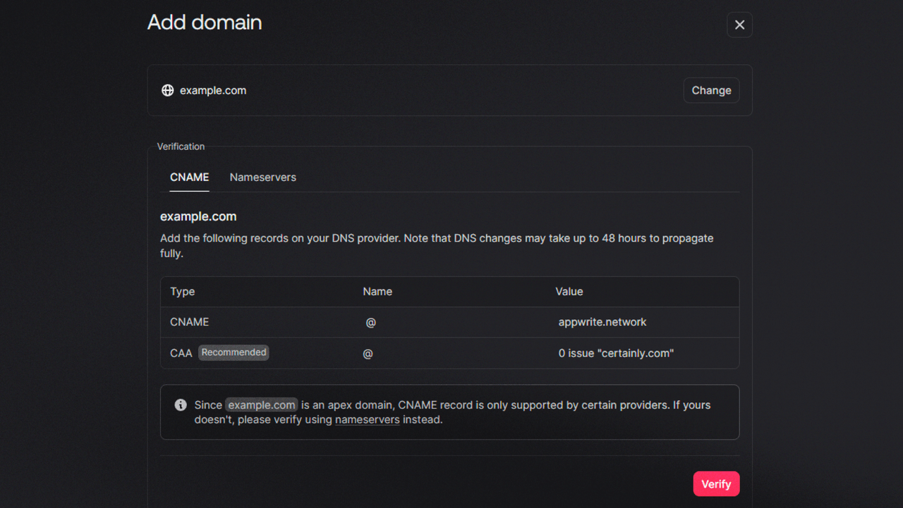 That's it. Appwrite handles CNAME flattening on its end once your domain is verified.
