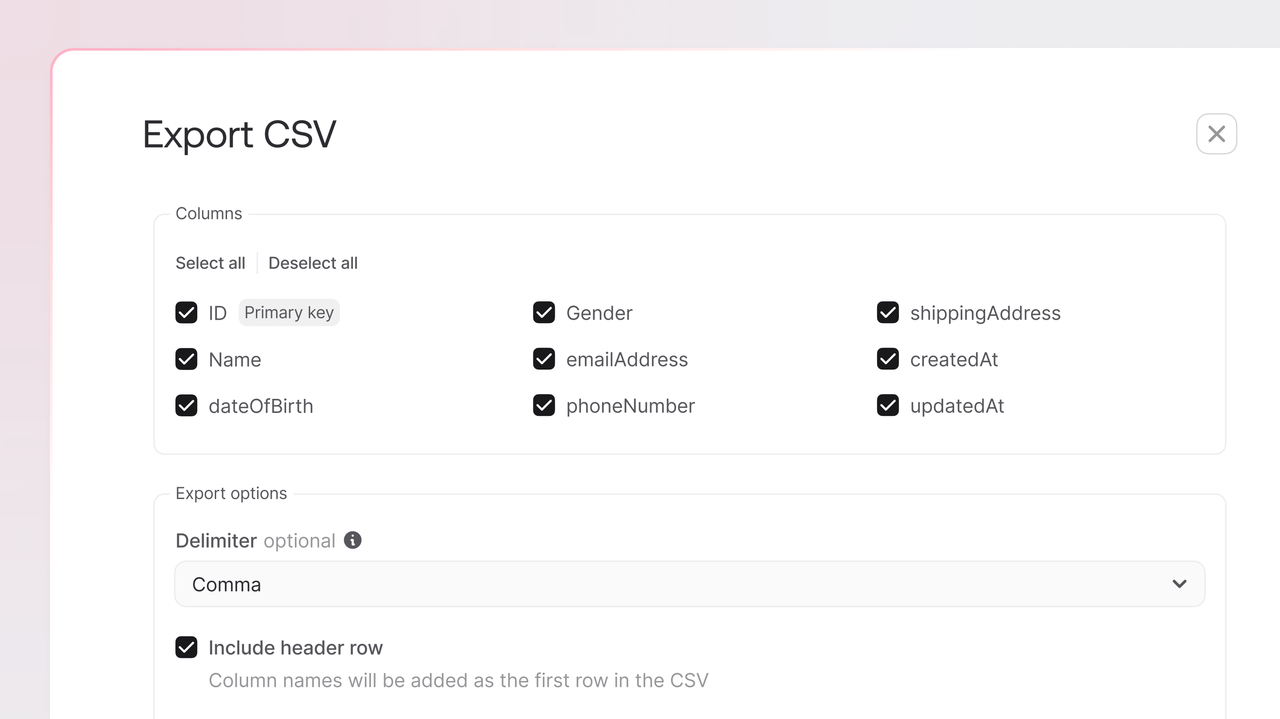 Appwrite now supports exporting data to CSV directly from the Console. This feature simplifies data extraction and reporting without requiring SDKs or custom scripts.