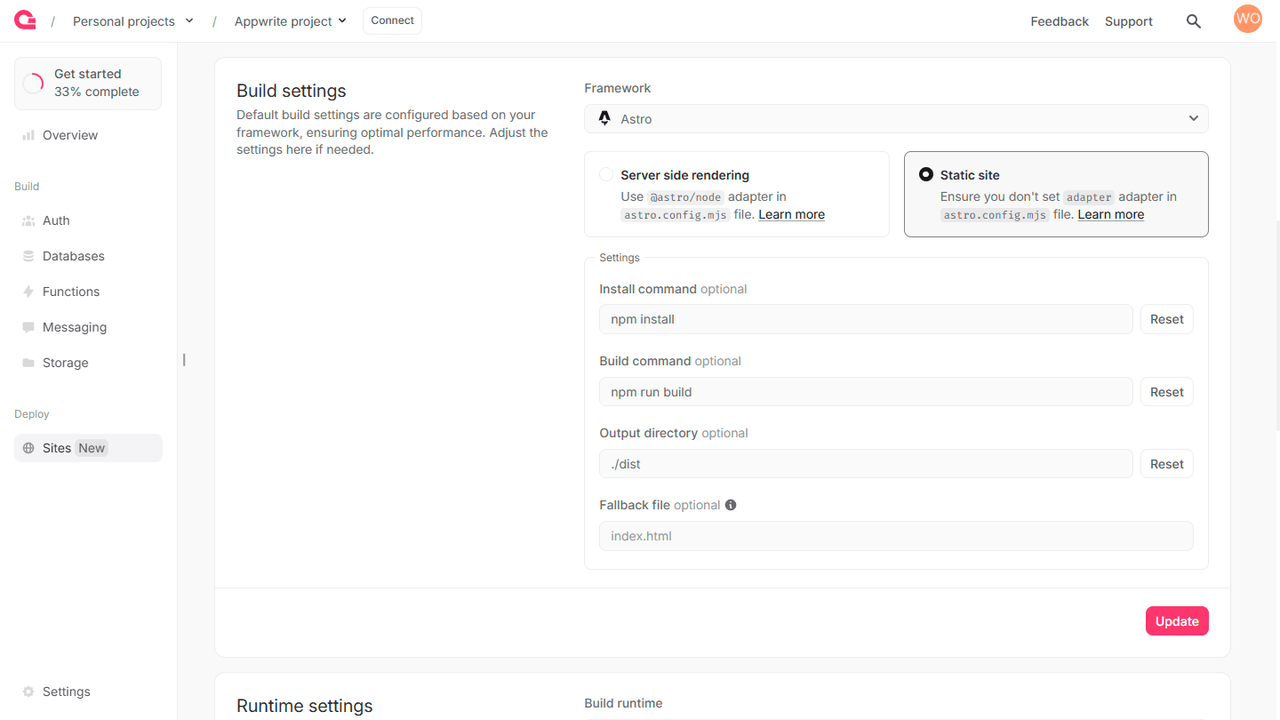 - Navigate to your site in the Appwrite Console and head to the Settings tab > Build settings section