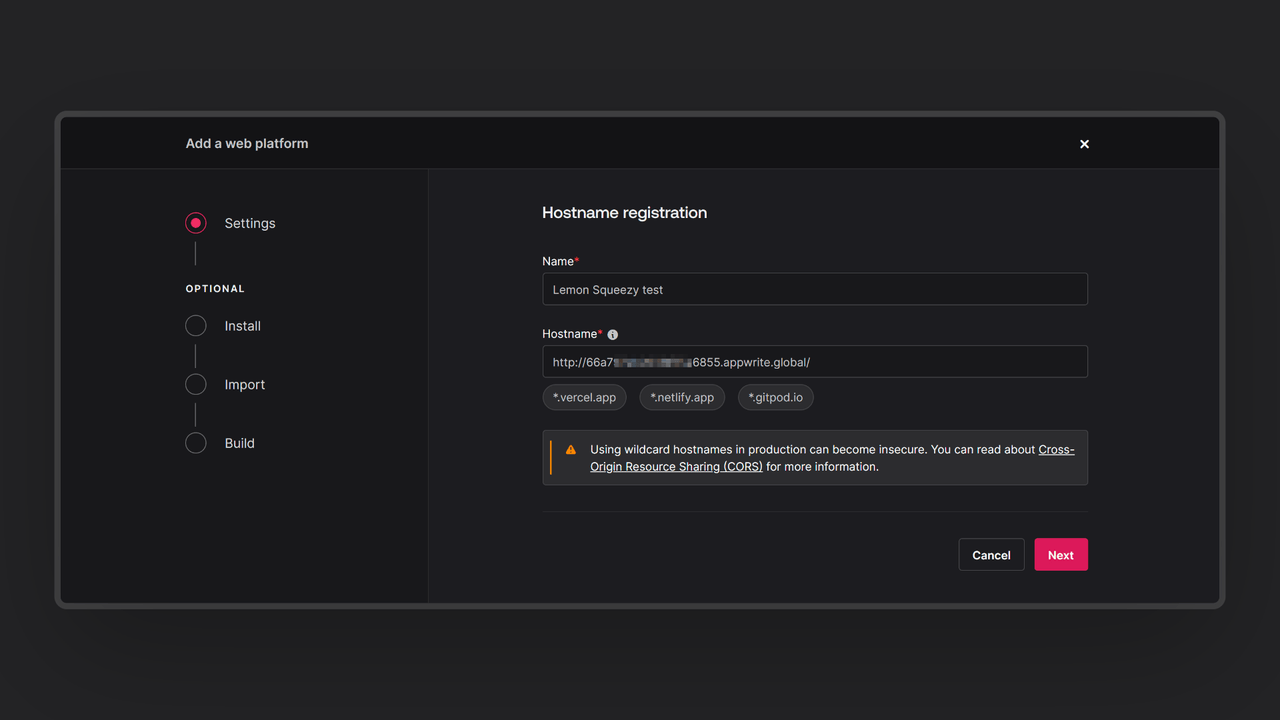 Once all the steps are complete, it is time to test the function! First, copy the function URL, go to the Appwrite project dashboard, and add it to the Platforms section as a web app. This will register your function URL as an authorized hostname to interact with Appwrite (to prevent CORS).